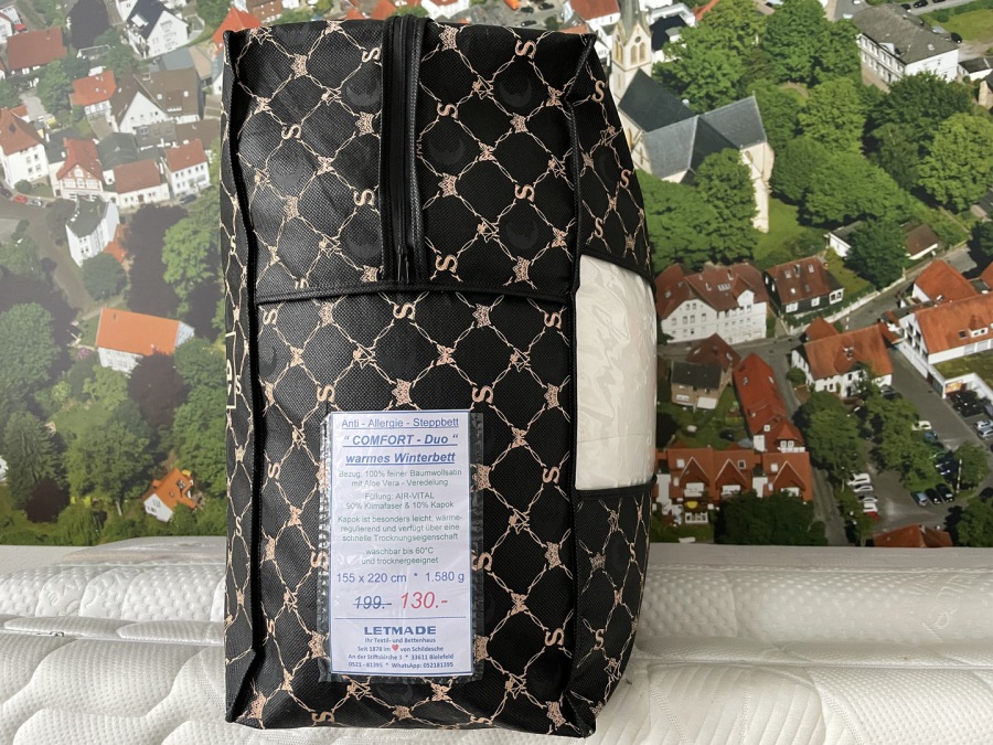 Bezug: 100% Baumwollsatin mit Aloe Vera - Veredelung * Füllung: 90% Air-Vital Klimafaser & 10% Kapok. Kapok ist leicht, wärmeregulierend und trocknet schnell. Das Bett ist waschbar bis 60°C und trocknergeeignet * 169.- 110.-